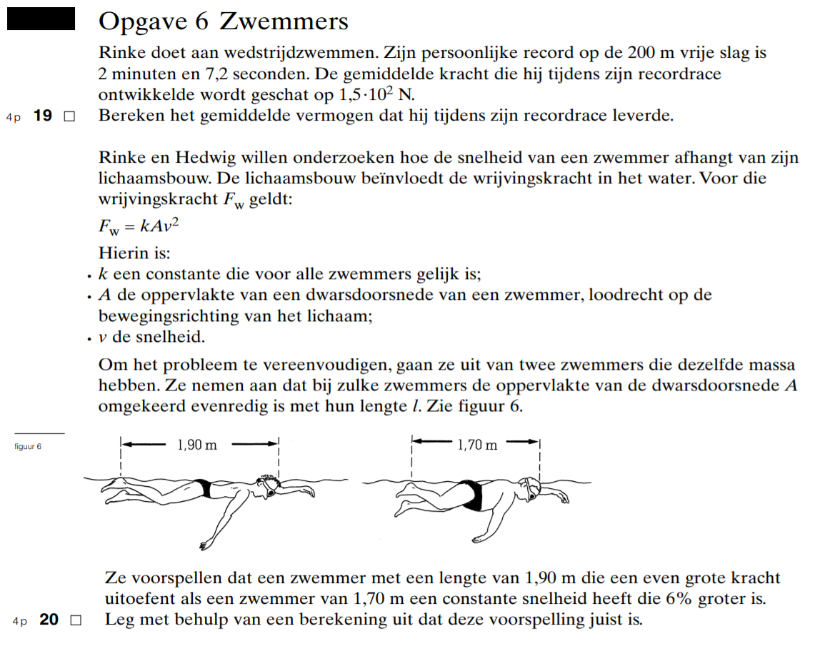 Hieronder vind je de natuurkunde eindexamenopdracht Zwemmers. Dit is een vwo-eindexamenopdracht van het 1ste tijdvak uit 2001. Het is een goede oefening voor het domein kracht en beweging. Opgave 19 en 25 gaan over arbeid en energie. Bij opgave 20 ligt de nadruk op krachten. Probeer de opdrachten eerst zelf te maken en controleer vervolgens je antwoord met de uitwerkingen.
