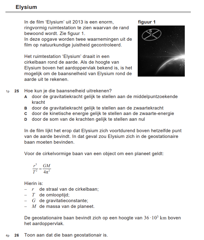Hieronder vind je de natuurkunde eindexamenopdracht Elysium. Dit is een havo-eindexamenopdracht van het 1ste tijdvak uit 2019. Het is een goede oefening voor het domein gravitatie. Dit gaat over cirkelbewegingen en dan vooral over cirkelbewegingen in het heelal. Probeer de opdrachten eerst zelf te maken en controleer vervolgens je antwoord met de uitwerkingen.